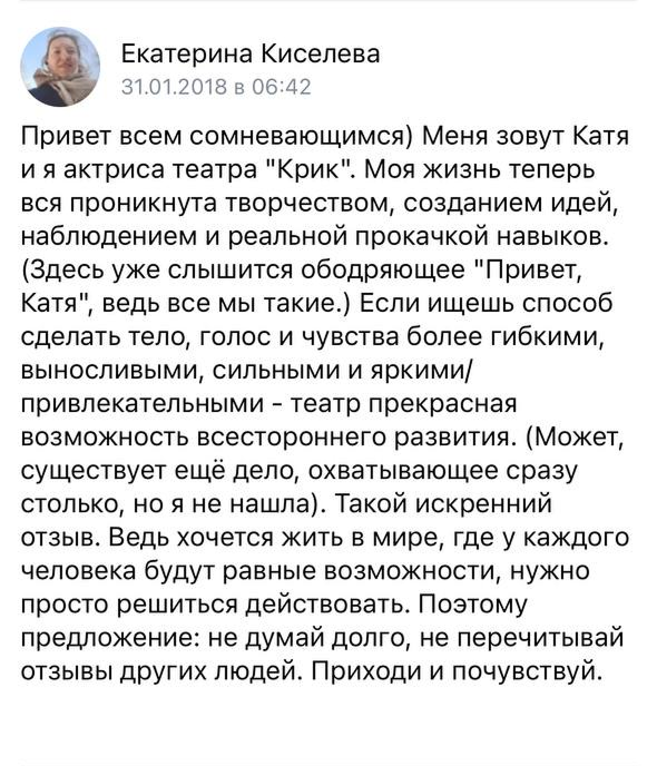 Лучшие выпускники переходят в бесплатную театральную студию и сотрудничают с театром «Крик».